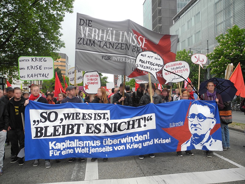 „Denn so, wie es ist, bleibt es nicht!“ – Dieser Auffassung des Kommunisten und Schriftsteller Bertold Brecht folgten beim Antikapitalistischen Block auf der 1. Mai Demonstration des DGB in Freiburg erneut etwa 100 Menschen. Der Block knüpfte damit direkt an das Motto des letzten Jahres an, denn „Von selbst wird die Welt nicht besser“ und begeisterte die Gewerkschaftsdemonstration mit Parolen, bunten Schildern und einer kämpferischen Rede.