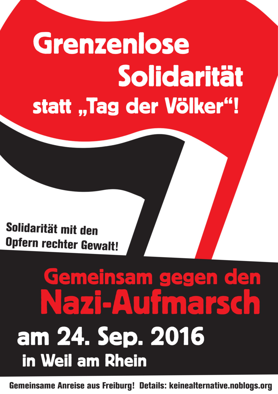 ++++ Rechter Aufmarsch für den 24. September abgesagt++++ Wohl verschoben auf November ++++ Achtet auf Ankündigungen++++ Gemeinsam zu den antifaschistischen Protesten gegen den Nazi-Aufmarsch am 24.September in Weil am Rhein! Anreise ab Freiburg, weitere Infos in Kürze. Wir unterstützen den Aufruf der Initiative „Keine Alternative“: „Faschisten um den Ortsverband der neonazistischen Kleinstpartei „Die Rechte“ rufen […]
